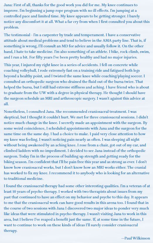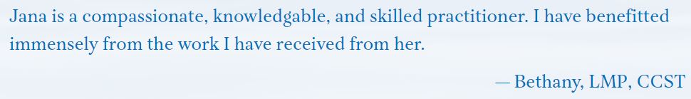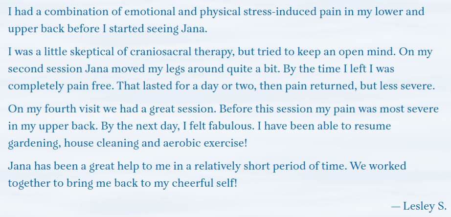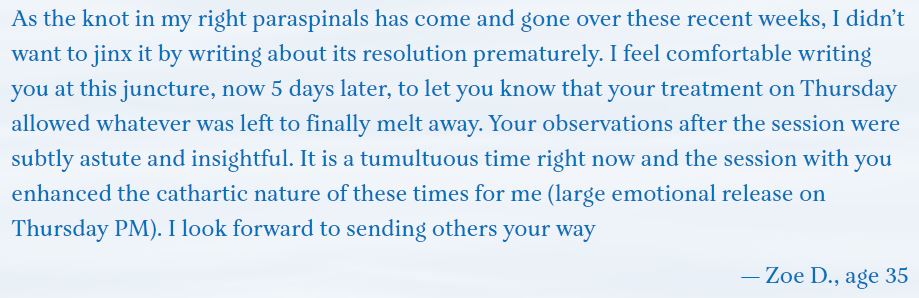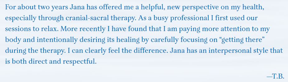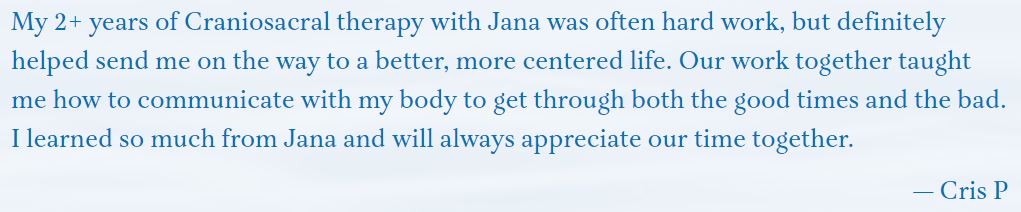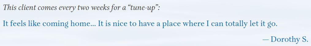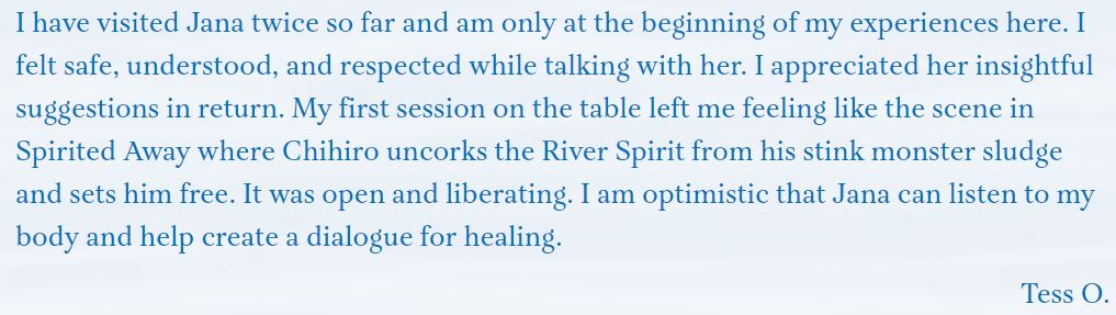 I pride myself on respecting and honoring each individual client and their circumstances. I am awed by the human body’s amazing ability to heal, and feel honored to witness and support each person’s unique healing process.”